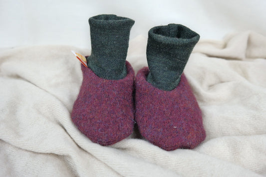 Warme Babyschuhe 3-6 M aus Upcycling Wolle in Beerenlila und Dunkelgrün