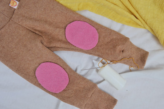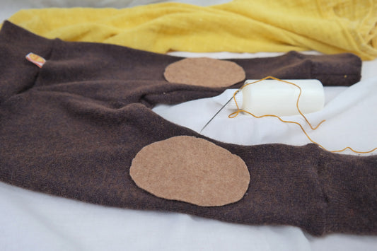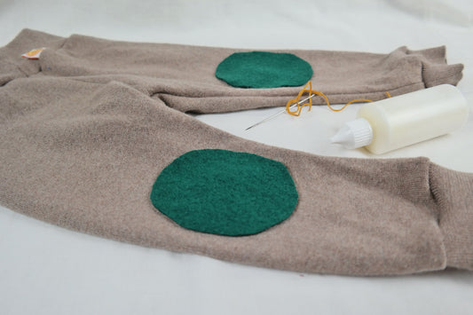 Du kannst die Patches mit einigen Stichen per Nadel und Faden befestigen oder sie mit einem Textilkleber festkleben. Alle Patches bestehen aus verdichteter Upcycling-Wolle und haben eine Beschaffenheit wie Wollwalk.